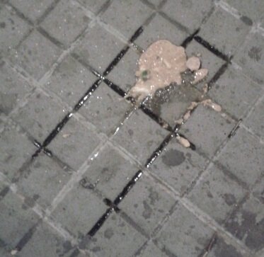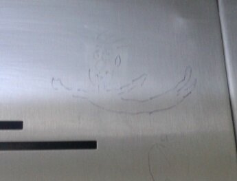 Bueno, en fin, me voy a centrar en las fotos, que no tengo tiempo para jugar al Guacarimoi. Os traigo material especialmente rough: sinsabores y asco puro. Hoy toca apretar los dientes y mirar las fotos con cara de circunstancias. Primero os propongo unas morrallas gráficas (vistas en el ascensor de mi edificio y en el espejo convexo de la entrada de un parking subterráneo). Todos hemos visto estos tristes y fragilísimos intentos artísticos y apenas nos inmutamos. Valorémoslos, por favor. No es nada fácil reunir la fuerza de espíritu necesaria para trazar algo soñador en soportes tan, tan ingratos, ¡qué insípidos llegan a ser estos dibujos! ¡Uno se sorprende hasta de que los hayan terminado! Mirad este: