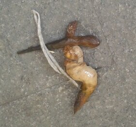 Y me despido con esta mierda que fotografié en Valencia. Un canapé exquisito. Doy gracias a dios por habérmela cruzado. Rápida transición del marrón oscuro y compacto a una espuma brillante en tonos café. Un garrote cagado con mucha gracia sobre la primera porción convierte el conjunto en una figura antropomorfa que parece sentarse sobre el cordel que alguien debió colocar después con buen criterio y delicadeza. Como una bruja subida a una escoba vertical… O una escena bíblica del desierto… Algo ocurrido en Israel… Feliz Navidad.